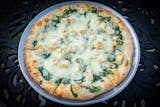 Our version of the four cheese pizza starts with a pesto base, then we add mozzarella, provolone, fontina, and parmesan cheeses and topped with spinach and tomato slices.